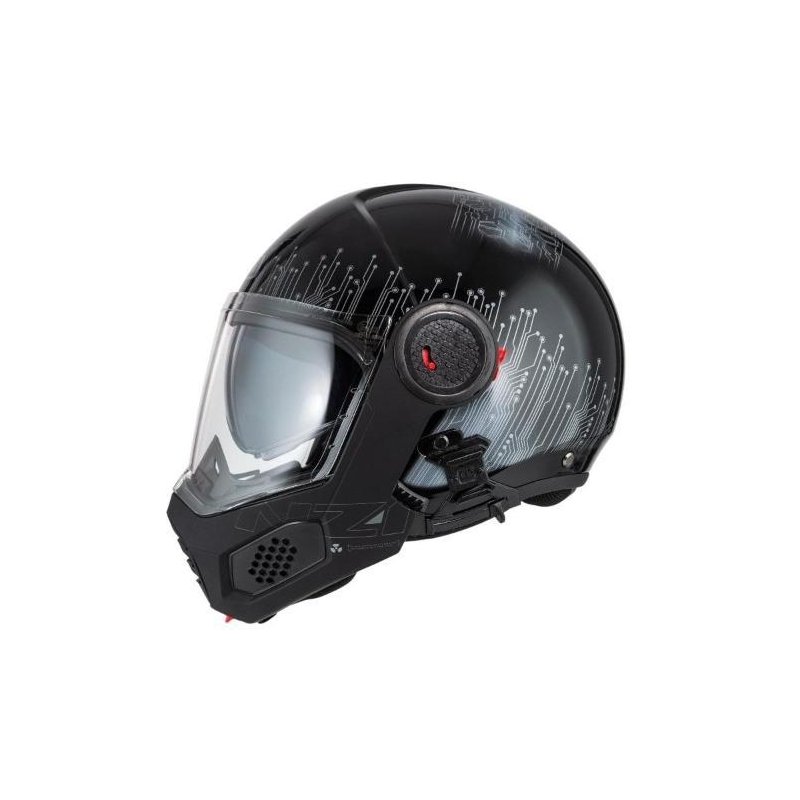 Mecanismo de cierre de protección maxilar abatible de metal reforzado. Sistema de retención reforzado, para mantener el casco en su lugar sobre la cabeza del motociclista sea cual sea la dirección de donde provengan los impactos. Señalizador reflectante, evitará accidentes por alcance.