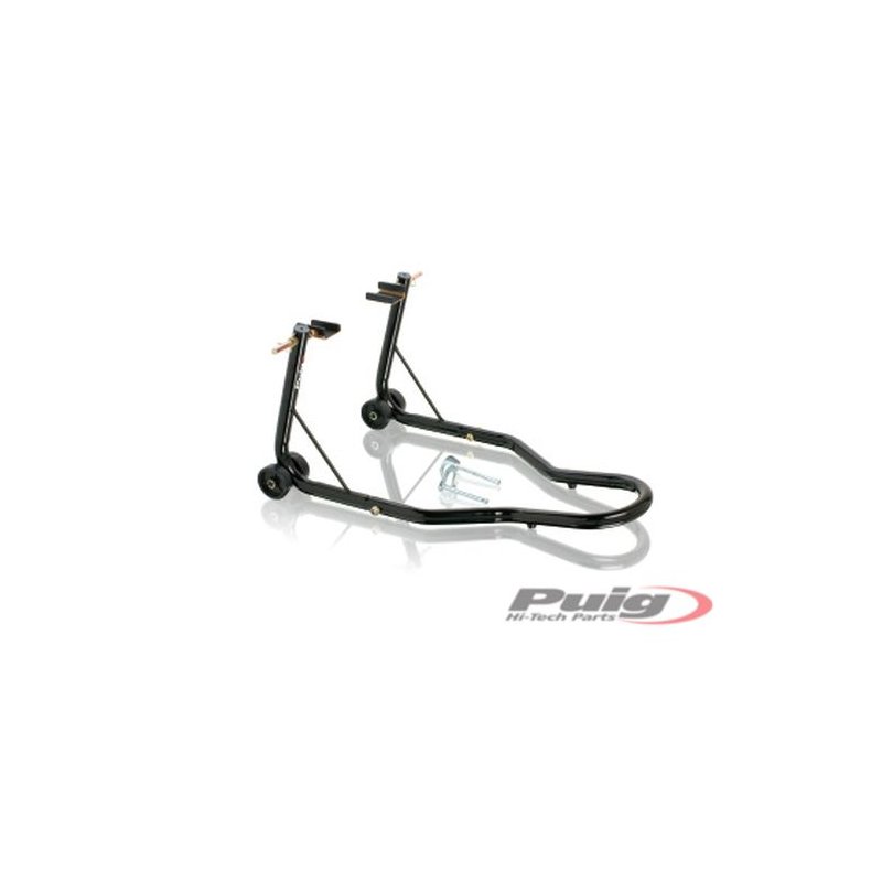 Caballete trasero Puig 4322N. Incluye un juego de adaptadores para los soportes caballete (diabolo) y un juego de ángulos por si se sujeta directamente al basculante.